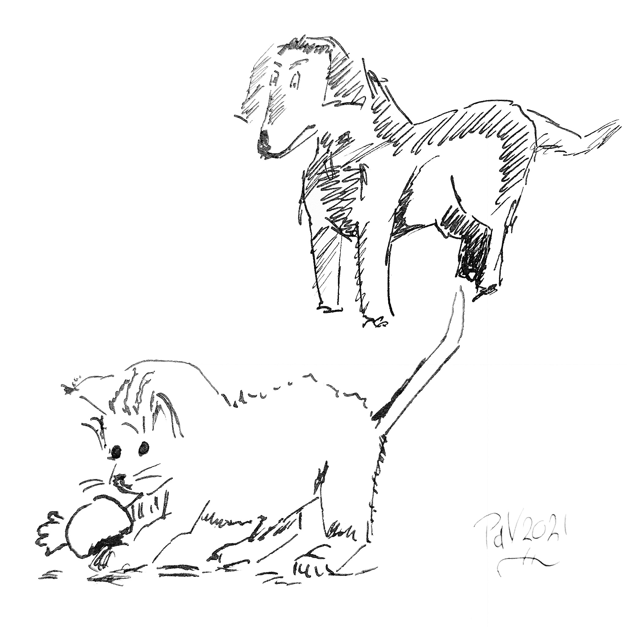 A drawing of a kitten and a dog – India Ink
